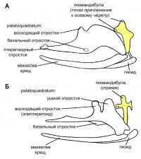 Челюстная и гиоидная дуги кистеперой рыбы (А) и примитивной амфибии (Б). У амфибии появился новый — ушной — отросток палатоквадратума, прирастающий к слуховой капсуле, а гиомандибула потеряла опорную функцию и превратилась в слуховую косточку — стремя. Источник иллюстрации: Дзержинский, 2005.