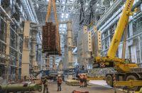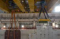 Сразу объединения зданий началось испытания крановой системы и реакции металлоконструкций зданий (на фото выше краны как раз стоят на перемычке). Напомню, что спарка мостовых кранов обладает грузоподъемностью 1500 тонн, а испытания проводились с нагрузкой 820 тонн на переднем кране и 150 на заднем.