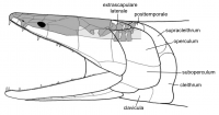 Реконструкция черепа позднедевонской кистеперой рыбы Mandageria fairfaxi. Она очень своеобразна, но сейчас интересна нам просто как пример кистеперой рыбы, более-менее близкой к тетраподам. Покровные кости изображены так, как будто они частично прозрачные. Сlavicula, cleithrum, supracleithrum, posttemporale — покровные кости плечевого пояса. Extrascapulare laterale — покровная кость крыши черепа, с которой соединяется posttemporale. Это та самая связь плечевого пояса с черепом, которая у тетрапод разрывается. Впрочем, отдельные покровные кости плечевого пояса, особенно расположенные в брюшной области, у них могут сохраняться; clavicula, она же ключица, есть и у человека. Operculum, suboperculum — крупные покровные кости жаберной крышки, у тетрапод исчезающие. Таким образом,