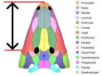 Череп древней амфибии — ксенотозуха (Xenotosuchus). Жил он довольно поздно (в триасе) и был вторичноводным; желающие могут пойти в Палеонтологический музей и полюбоваться на метровый череп близкого к нему мастодонзавра. Эти детали, однако, сейчас не имеют для нас особого значения. Ксенотозуха я выбрал просто потому, что это хорошее, четкое, в меру схематичное изображение черепа древней амфибии. Стрелкой отмечена предглазничная часть черепа, и мы видим, насколько сильно она разрослась, особенно по сравнению с кистеперыми рыбами, у которых никогда не бывает таких пропорций. "Какой хряпальник!" — с восторгом говорил о таких черепах один выдающийся палеонтолог. Справедливости ради надо отметить, что бывают и